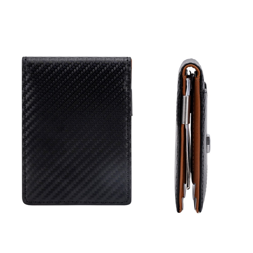 Este tarjetero compacto no solo ofrece un diseño minimalista y funcional, sino que también cuenta con protección RFID, evitando el escaneo de tus tarjetas.
